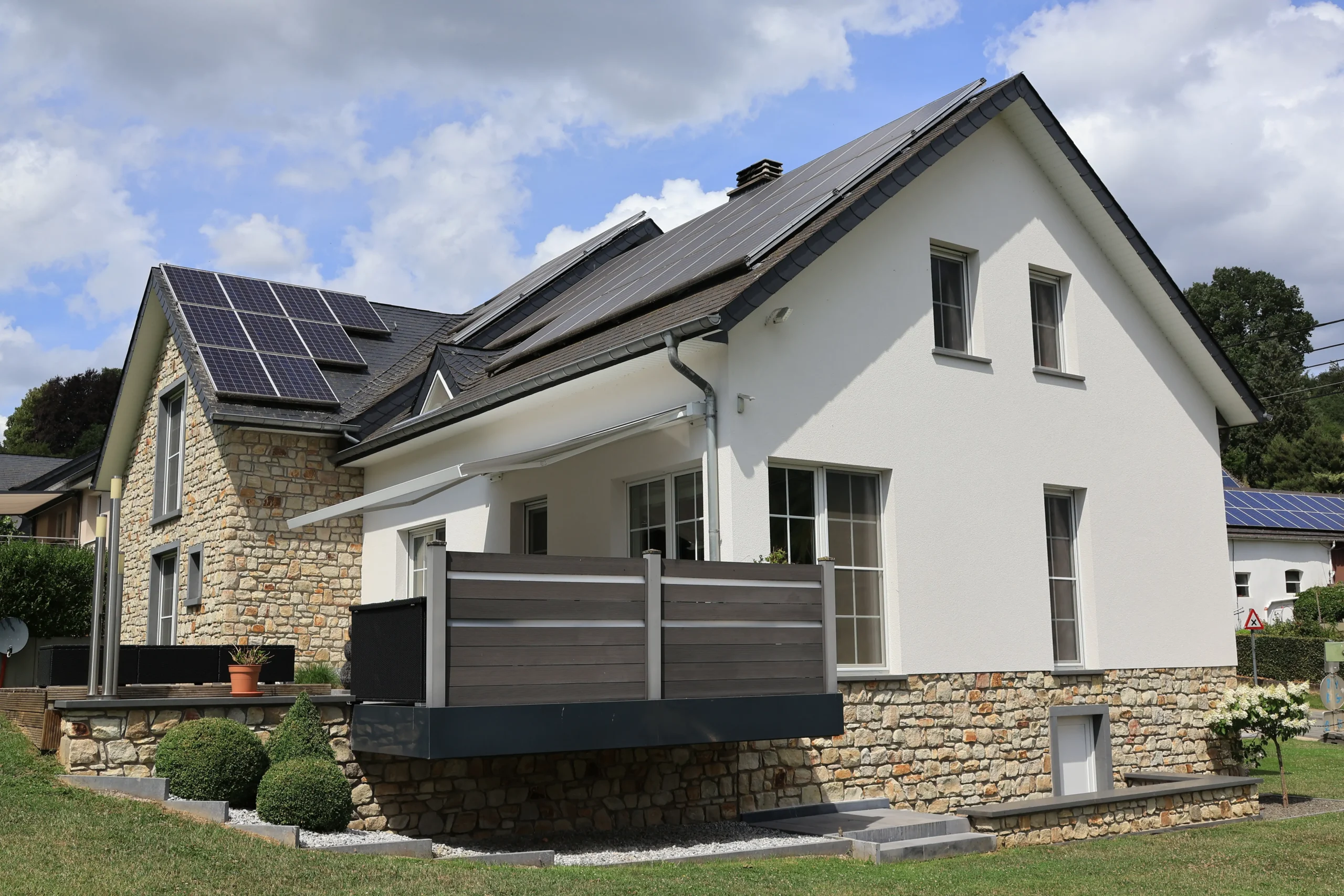 Grâce à une conception bien pensée – incluant un socle en pierre naturelle et un large débord de toit – cette façade se présente aujourd’hui, près de 8 ans plus tard, dans un état preque comme neuf. Les fenêtres et le store de l’entreprise Brever Windows&more de Troisvierges complètent cette image harmonieuse.